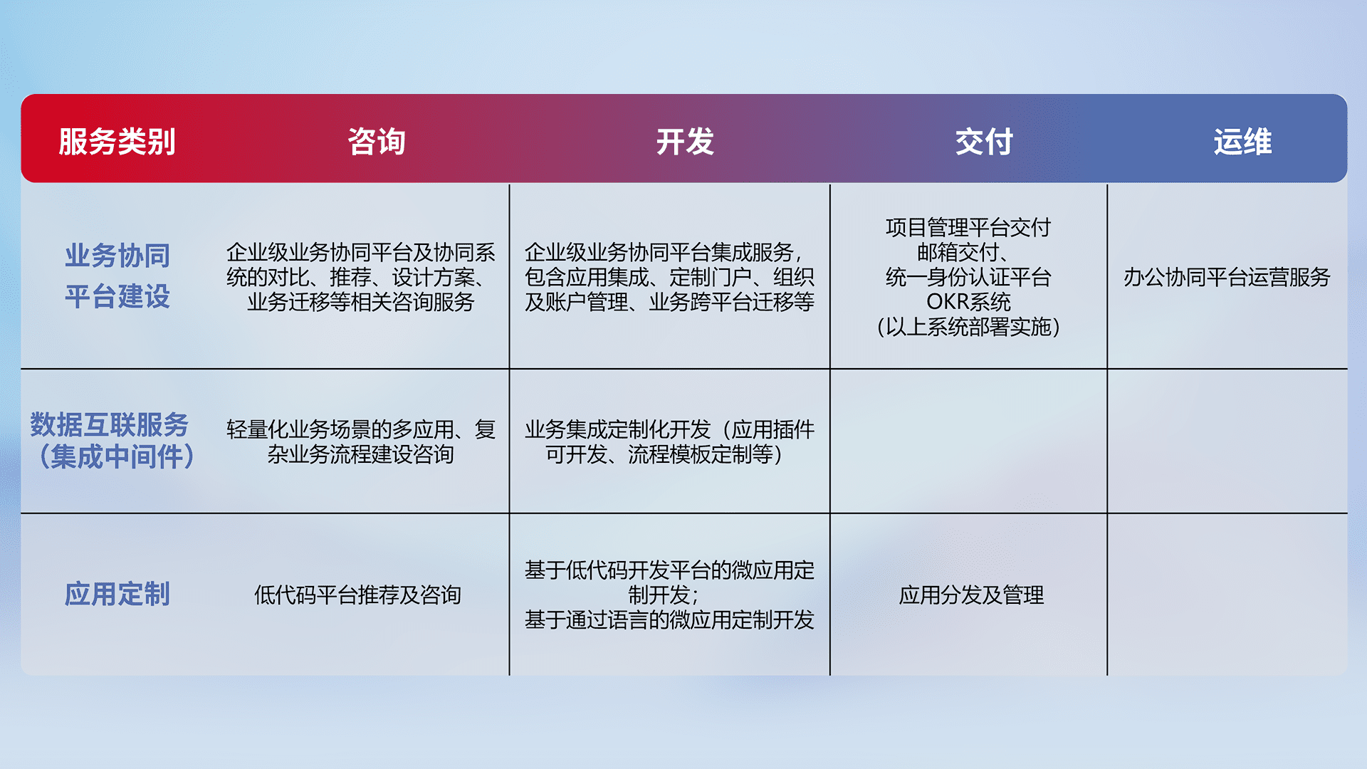 针对钉钉、、、企微、、、IDaas等平台级产品提供产品的规划、、方案、、、、交付、、、、定制化开发等服务,,,实现如统一协同办公、、、智能客户服务、、、混合会议管理、、、、智能数据查询、、、等业务场景,,实现数字化转型。。。