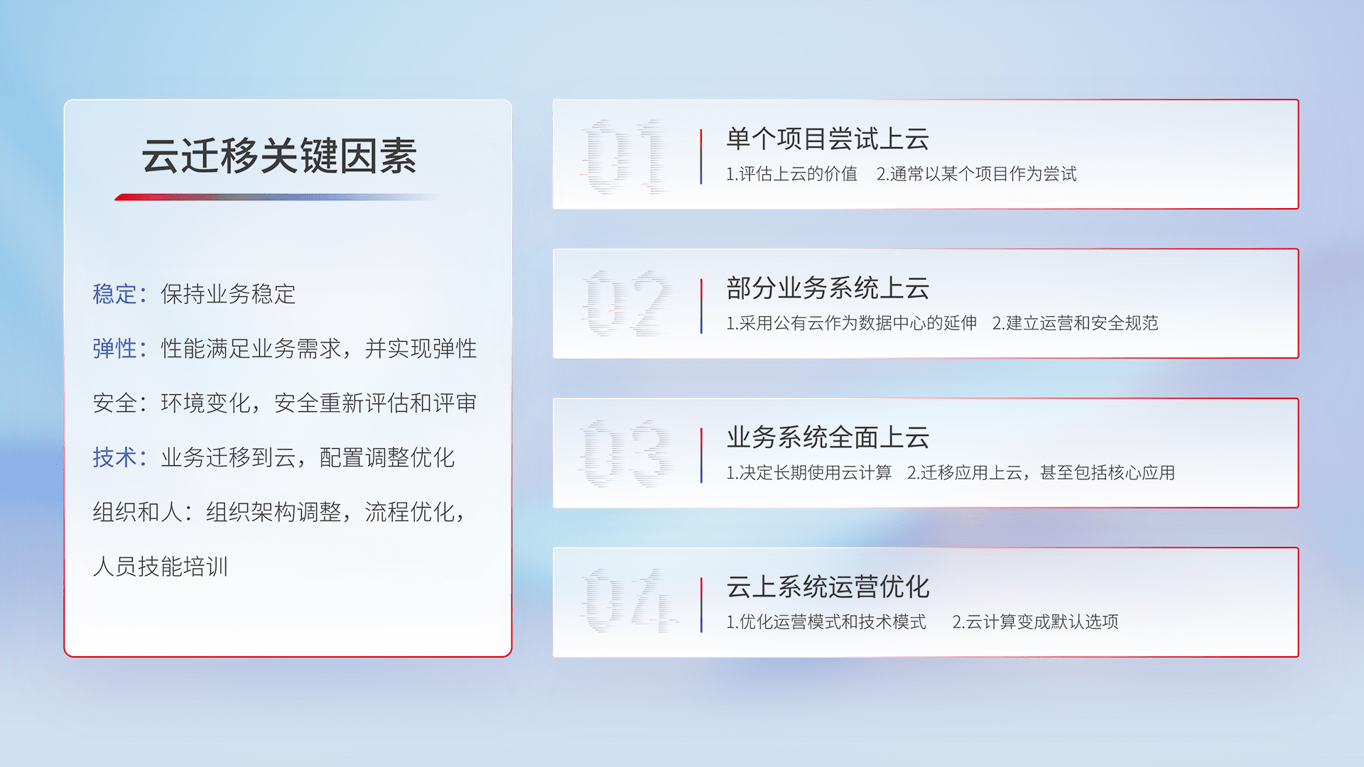 结合实际业务,,从规划设计、、、云平台选型、、、云原生改造、、、、数据迁移、、、集成交付,,迁移全过程为客户识别最佳上云路径,,,做好风险识别管理,,,,设计网络架构、、、、身份权限、、、、安全审计合规、、、操作审计、、、、日志审计、、、监控告警策略、、、、多站点容灾设计等,,,,对云上基础设施进行整体规划,,提升IT治理水平,,以满足弹性、、、、高可用、、、高性能的需求。。。