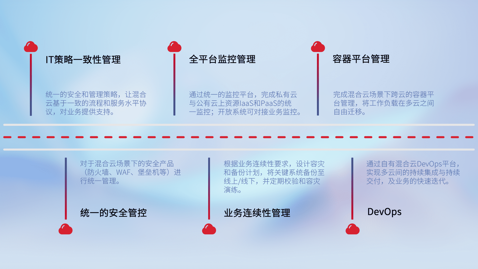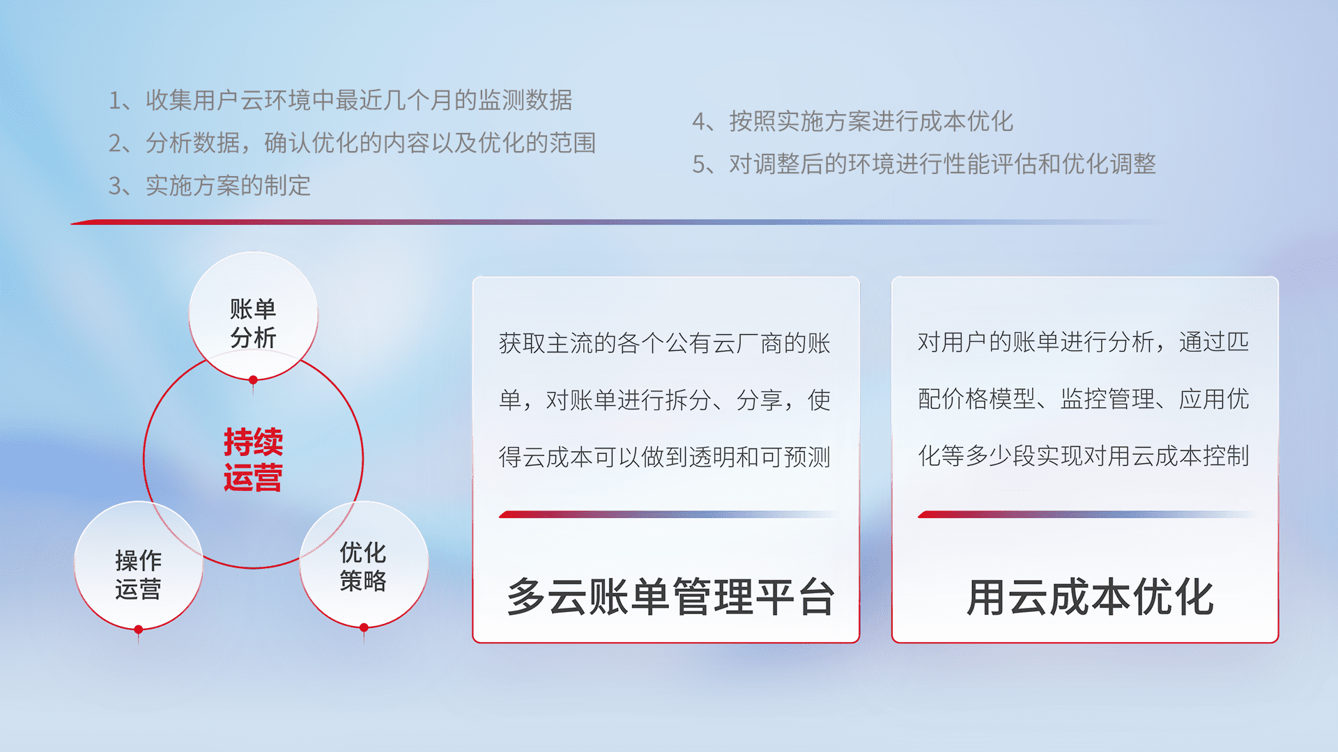 通过多云纳管,,,,以统一的资源数据模型把客户的云资源进行抽象和封装,,,,进而实现对多云资源的统一操作,,,保障云资源管理的可靠性、、稳定性与可用性。。。量身定制化运维内容,,配置、、、开发运维、、、补丁管理、、备份、、监控、、、、认证和访问管理、、审计和日常巡检等,,,,保障在用云过程中的可靠度,,,,稳定度以及高可用率。。